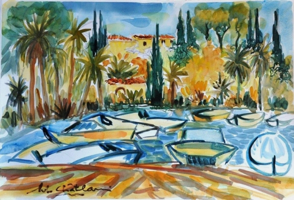 "Flash Barques", aquarelle, 65x50cm. 2019. Oeuvre de Bob CHATELAIN, peintre aquarelliste.