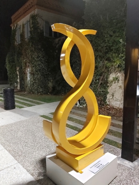 "Ballet de Feu" Sculpture monumentale. Acier thermolaqué jaune brillant . 160 cm de haut 2019. Oeuvre statuaire abstraite de Chantal DERDERIAN-CHRISTOL, sculptrice.