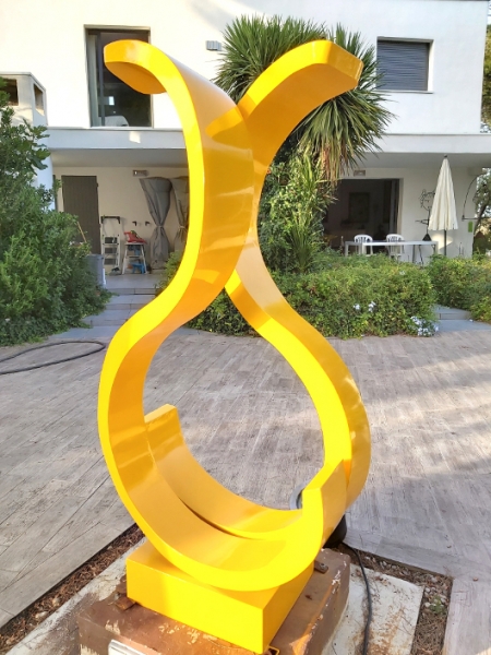 "Ballet de Feu" Sculpture monumentale. Acier thermolaqué jaune brillant . 160 cm de haut 2019. Oeuvre statuaire abstraite de Chantal DERDERIAN-CHRISTOL, sculptrice.