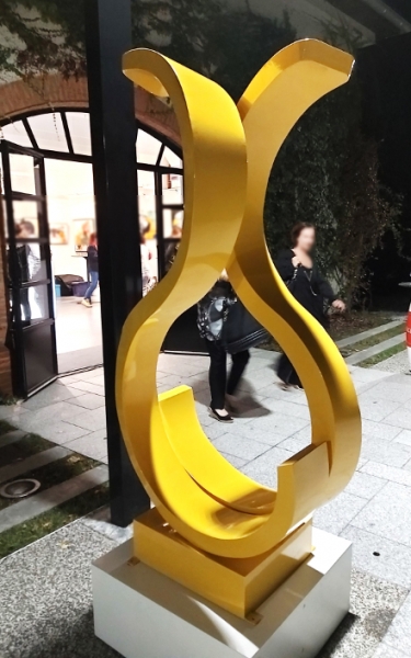 "Ballet de Feu" Sculpture monumentale. Acier thermolaqué jaune brillant . 160 cm de haut 2019. Oeuvre statuaire abstraite de Chantal DERDERIAN-CHRISTOL, sculptrice.
