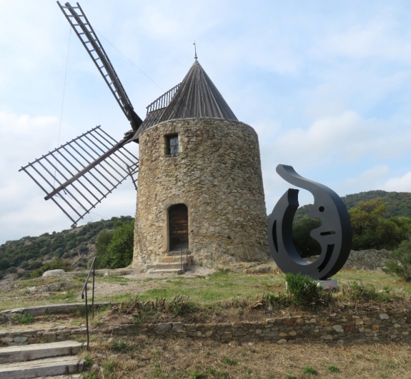 "Quand la Lune Rencontre le Soleil" installée à droite du Moulin. Sculpture monumentale réalisée en 2018 : Acier thermolaqué .300 cm de haut x 240 cm de large. Oeuvre statuaire abstraite de Chantal DERDERIAN-CHRISTOL, sculptrice.