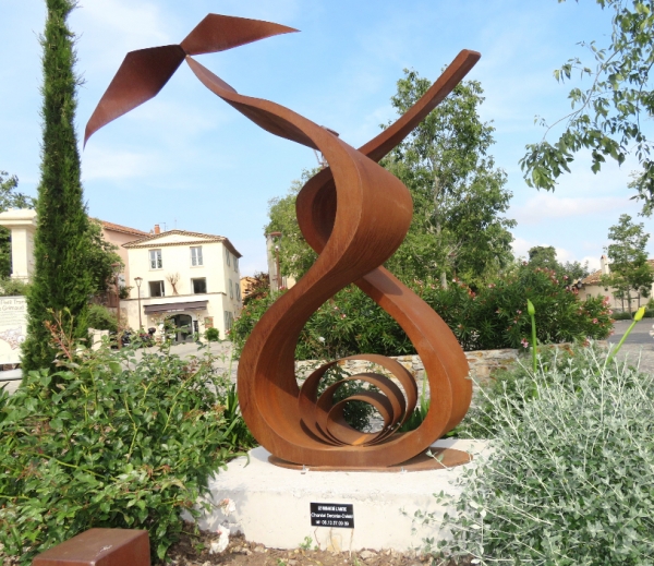 " Ruban de l'Amitié", sculpture installée à Grimaud. Réalisée en 2018 en acier corten (290 cm de haut) Sculpture monumentale réalisée en 2018 : Acier thermolaqué .300 cm de haut x 240 cm de large. Oeuvre statuaire abstraite de Chantal DERDERIAN-CHRISTOL,