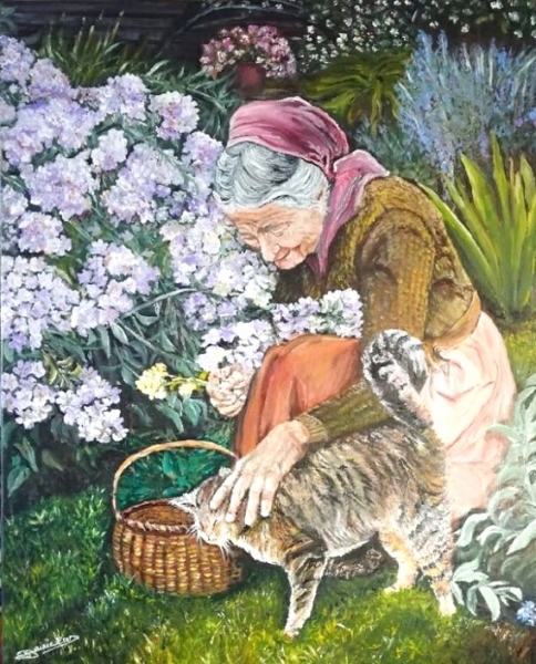 "Tasha et son Chat". Peinture. (65x81cm) Acrylique sur lin - 2018. Oeuvre de Frédéric Boirie.