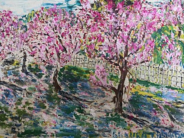 "Cerisier III","Sakura", Huile sur toile (50x70 cm) Peinture de Toshio Asaki