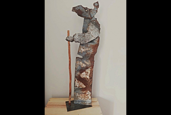"Randonneur". Matériaux: tôle rouillée, bois, papier dimensions: 73 x 20 cm oeuvre de Marie-Josèphe BALVET sculptrice