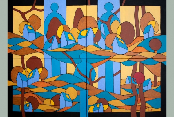 "L'Arbre Rouge aux Deux Silhouettes", 2022. Acrylique sur toile, 108x146cm, oeuvre du peintre Michel Marant