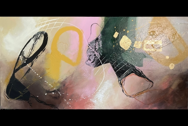 "Suspension", 50x10cm. Acrylique sur toile, Mixed Média Effets craquelés, collage et pastels,oeuvre de Marie Pierre HOGRET