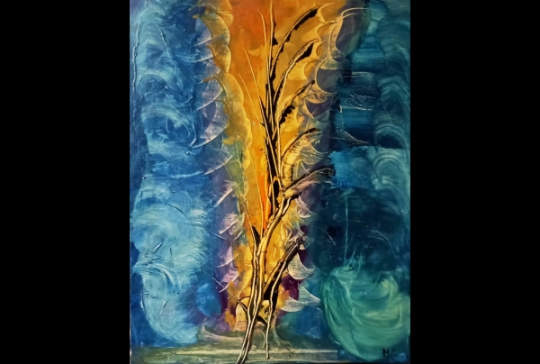 "Feu Sacré" 2014 Peinture de Michèle GUILLOT, Acrylique avec mains, spalters, couteaux. Toile tendue sur châssis bois avec entretoise. Haut. 80 cm, Larg. 65 cm, Epais 2,5 cm