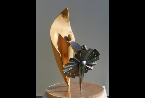 "La Muse et le Prophète", sculpture, hauteur : 67 cm x 45 cm ,acier, bois d'épicéa et sipo pour le socle et altuglas. Oeuvre de l'artiste Gabriel RICHARD.