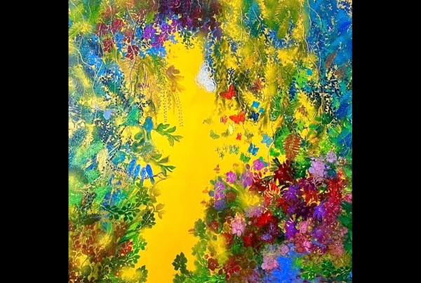 "Éden", huile, peinture, dimensions 100x100 cm. Une évocation emplie de lumière nous fait ressentir une idée du bonheur. Tableau d' Emma SAMPIL, artiste-peintre, Lauréate du Palmarès, Talent des Arts d'Aujourd'hui - Artiste d'Excellence 2024