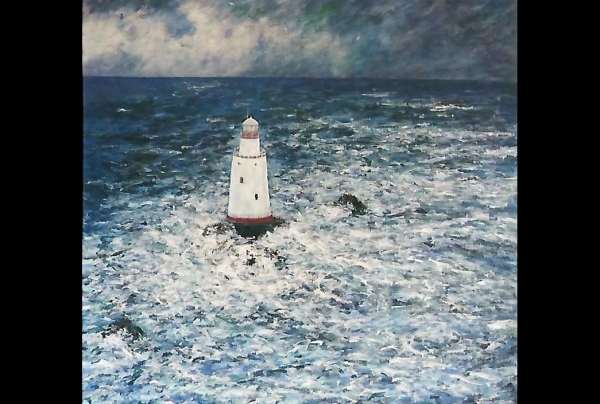 "Phare dans la Tempête" 80x80cm acrylique sur toile. Nicole EYNARD, crée une peinture de haut niveau. Amplitude et profondeur de l'horizon entre ciel et mer, jeux de lumières naturelles en jonction avec celles du phare. Émotions marines rares.