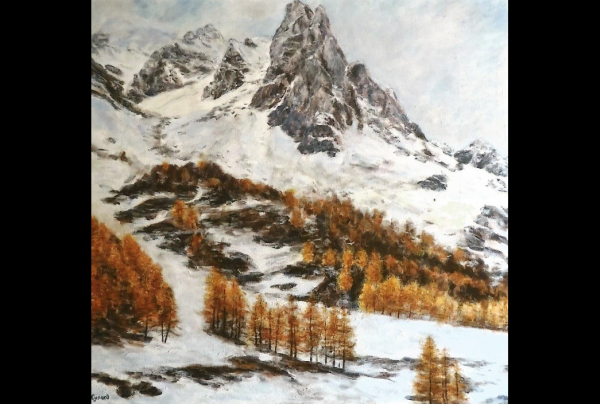 "Névache, les Rochers de Crépin" 80x80cm, acrylique sur toile. Une œuvre magistrale que nous fait partager ici Nicole EYNARD. Son style est authentique et puissant. Elle sait peindre la rudesse des reliefs et du climat et réussit à restituer leur vérité.
