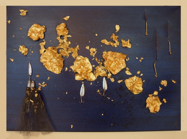 "RAVAGES" DE ANN-ISABELLE GUYOMARD, PEINTURE ABSTRAITE FEUILLE D'OR ET INCLUSIONS FIGURATIVES © 2011